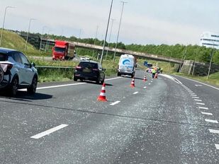 · Zowel de rechter- als de linkerrijstrook van de snelweg lag bezaaid met glas.
