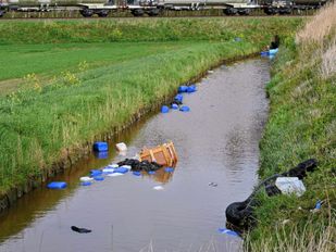 · Wat er precies in de vaten zit is nog niet bekend. Waarschijnlijk gaat het om vloeistoffen voor de productie van synthetische drugs.