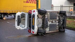 · Het busje kwam door de klap op zijn zijkant terecht. De auto belandde aan de andere kant met zijn neus in de sloot.