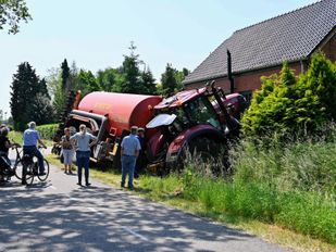 · Door de zware mestkar die achter de trekker hing verloor de bestuurder de macht over het stuur. Hij is door de klap uit het raam aan de achterzijde van de trekker gelanceerd.