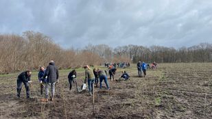 · Bijna honderd man stond vrijdag fanatiek bomen te planten. Het doel: meehelpen aan de realisatie van een compleet nieuw bos.