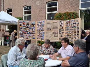 · In de Paterstuin was het gezellig druk met mensen die samen verhalen deelden over vroeger en nu. Er waren veel foto's verzameld voor de reünie.