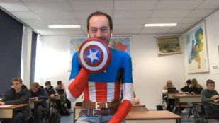 · Docent Youri Lavrijsen gaat deze week als Captain America door het leven op het Norbertus Gertrudis Lyceum, speciaal voor Giro 555 voor Oekraïne.