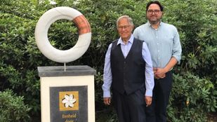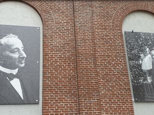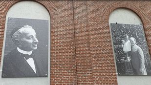 · Twee metershoge foto's van Mozes de Hes en Walter Süskind prijken sinds zondag aan de noordelijke gevelwand van de Bergse synagoge.