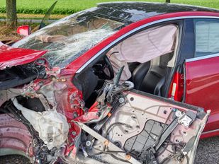 · De bestuurder van de rode Tesla wilde een andere auto inhalen en reed in op een bestelbus die van de andere kant tegemoet kwam.
