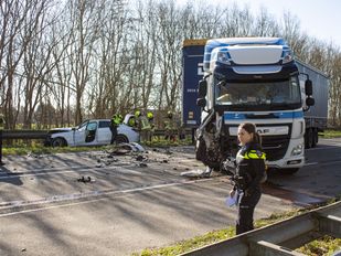 · De auto is frontaal op de vrachtauto geklapt. Er is een persoon per ambulance naar het ziekenhuis gebracht.