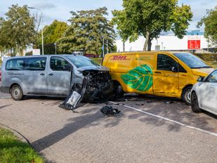 · Eerst raakten de twee busjes elkaar, waarna de wagen van de bezorgdienst tegen de personenauto aanreed.