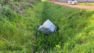 · De melkwagen belandde op zijn kant naast de dijk. De bestuurder is door de brandweer bevrijd. Hij raakte niet gewond.