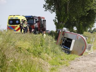 · De melkwagen belandde op zijn kant naast de dijk. De bestuurder is door de brandweer bevrijd. Hij raakte niet gewond.