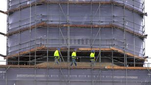 · De toren van de Sint-Gertrudiskerk in Bergen op Zoom - beter bekend als de Peperbus- staat in de steigers voor groot onderhoud.