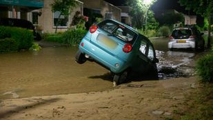 · Een auto is maandagnacht in een sinkhole beland, nadat een gesprongen waterleiding de straat volledig blank zette.