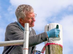 · Kiwanisclub Bergen op Zoom voorzien de stormvloedpalen langs de Slikkenburgseweg in Halsteren van een nieuwe lik verf.