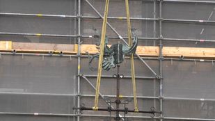· Met behulp van een grote hijskraan werd de phoenix die op de top van de toren in Wouw stond naar beneden gehaald voor renovatie.