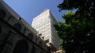 · De kerktoren in Wouw is van top tot teen ingepakt met steigers. Een grote renovatie van de kerktoren staat op het punt te beginnen.