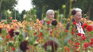 · Vrijwilligers van buurtschap Markt in Zundert zijn druk bezig met het plukken van de vele dahlia's.