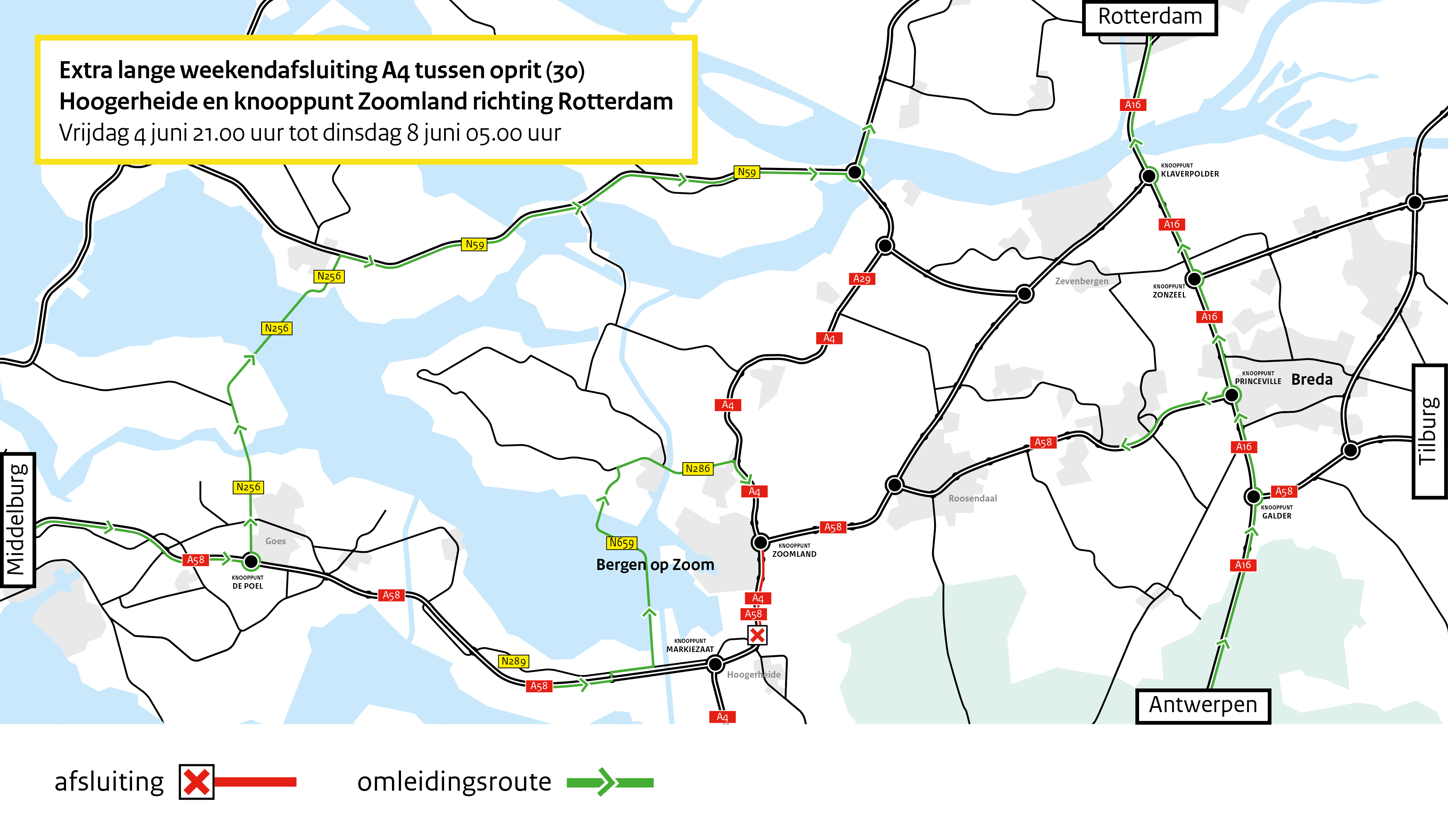 Weggebruikers die vanuit Vlissingen en Middelburg richting Rotterdam rijden, kunnen via de A58 tot knooppunt De Poel. Daar worden ze omgeleid over de N256 richting Zierikzee en de N59 richting Rotterdam. Verkeer dat op de A4 richting Roosendaal, Breda en Tilburg wil, wordt omgeleid via de A58 tot afrit 31 Rilland. Daarna via de N289 richting Tholen tot de carpoolplek Oesterdam, daar de N659 op en via de N286 naar de oprit 26 Halsteren, waar je de A4 terug op kunt richting Roosendaal, Breda en Tilburg.