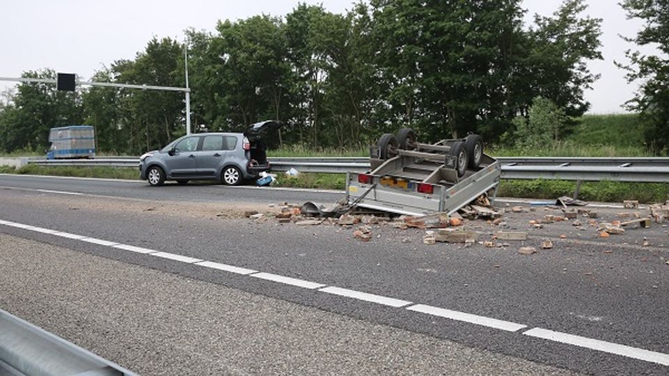 Op de A17 bij Roosendaal is zaterdagmiddag een auto met een aanhanger vol bouwafval gekanteld.