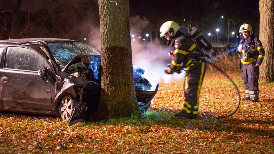 Achtergelaten auto rokend tegen boom, bestuurder gevlogen