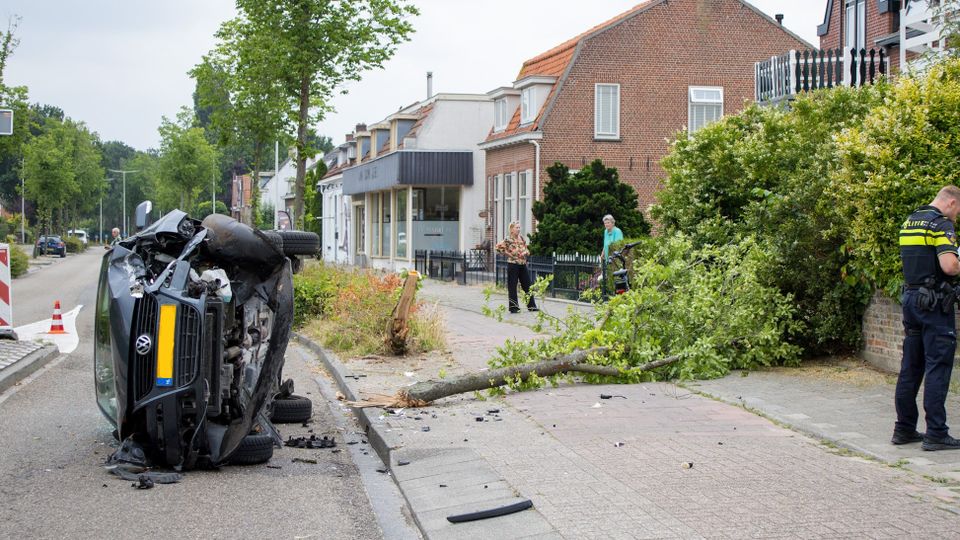 Auto rijdt boom omver en belandt op zijkant bij ongeval in Bergen op Zoom