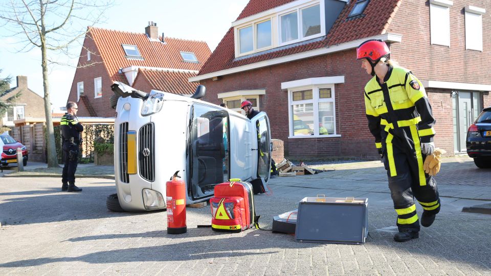 Waarschijnlijk is de chauffeur, een man op leeftijd, op een paaltje gebotst. Zo hard dat de auto kantelde en hij er door de brandweer uitgehaald moest worden. Het is niet duidelijk of de man gewond is geraakt. De hulpverleners hebben het voertuig weer op vier wielen gezet en naar de kant van de weg gereden.