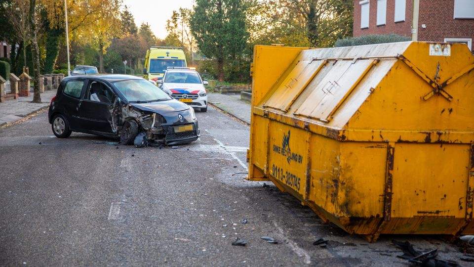 Auto flink beschadigd door botsing tegen container in Roosendaal