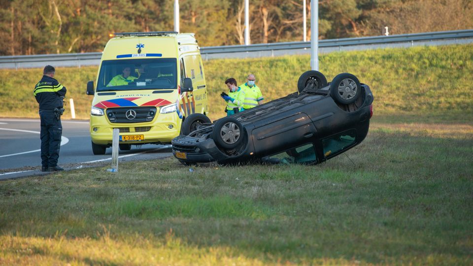 Auto na ongeval ondersteboven op afrit A58 bij Bergen op Zoom