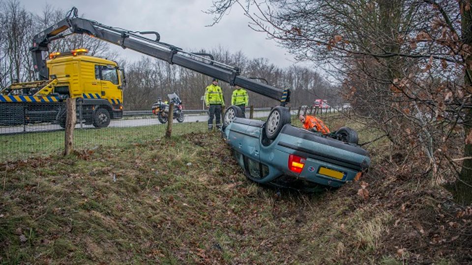 Een bergingsbedrijf heeft het voertuig weer uit de sloot getakeld. Het verkeer op de snelweg ondervond geen hinder van het ongeval