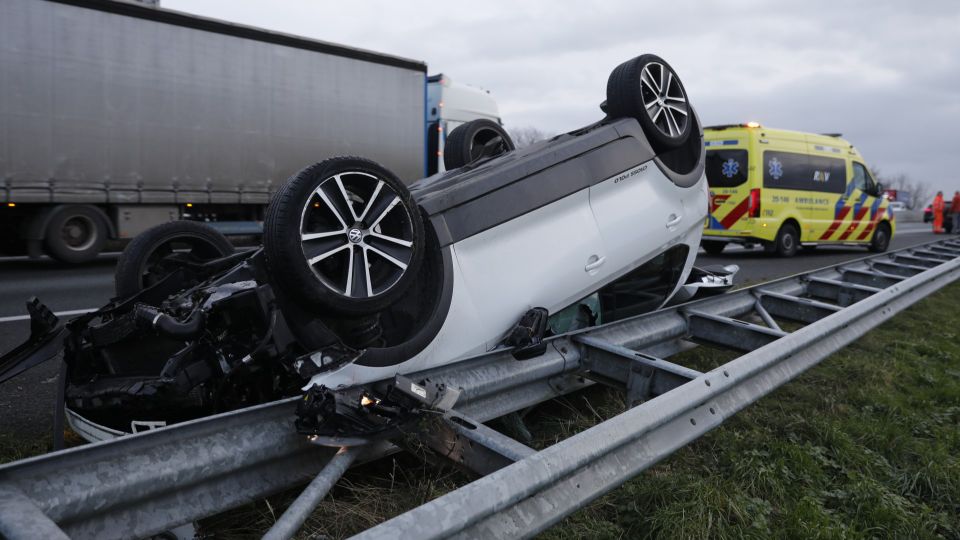 Een automobilist botste achterop een andere auto en kwam vervolgens in botsing met de vangrail. Door de impact belandde de auto op de kop. De bestuurder raakte lichtgewond en is uit voorzorg naar het ziekenhuis gebracht.
