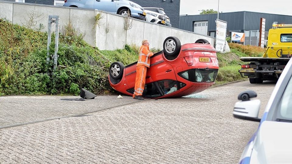 Een automobilist is donderdagmiddag over de kop geslagen op de Slingerweg in Bergen op Zoom.