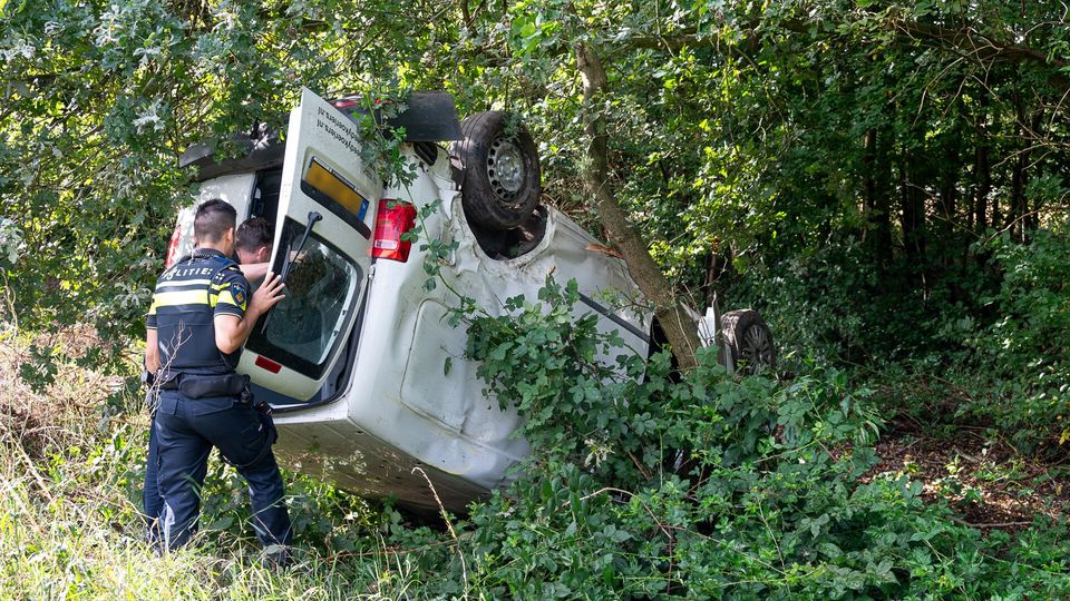 Bestelbus raakt van snelweg en komt op zijn kop in struiken terecht
