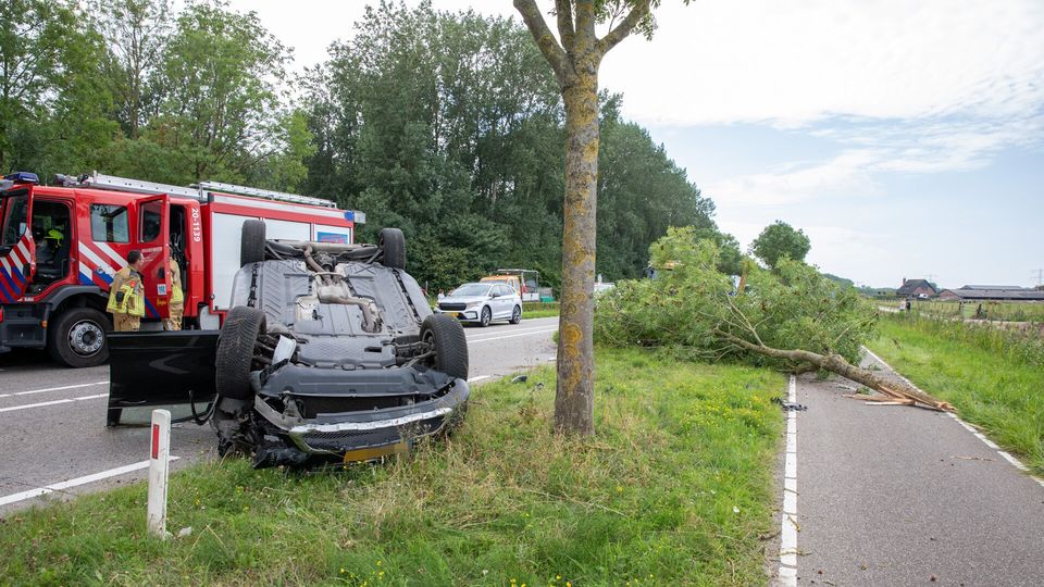 Auto rijdt boom omver en komt op zijn kop tot stilstand