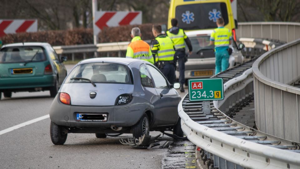 Een auto is donderdagochtend tegen de vangrail gebotst op de A4 bij Bergen op Zoom. Dat gebeurde op de verbindingsweg van de A4 naar de A58 richting Roosendaal.