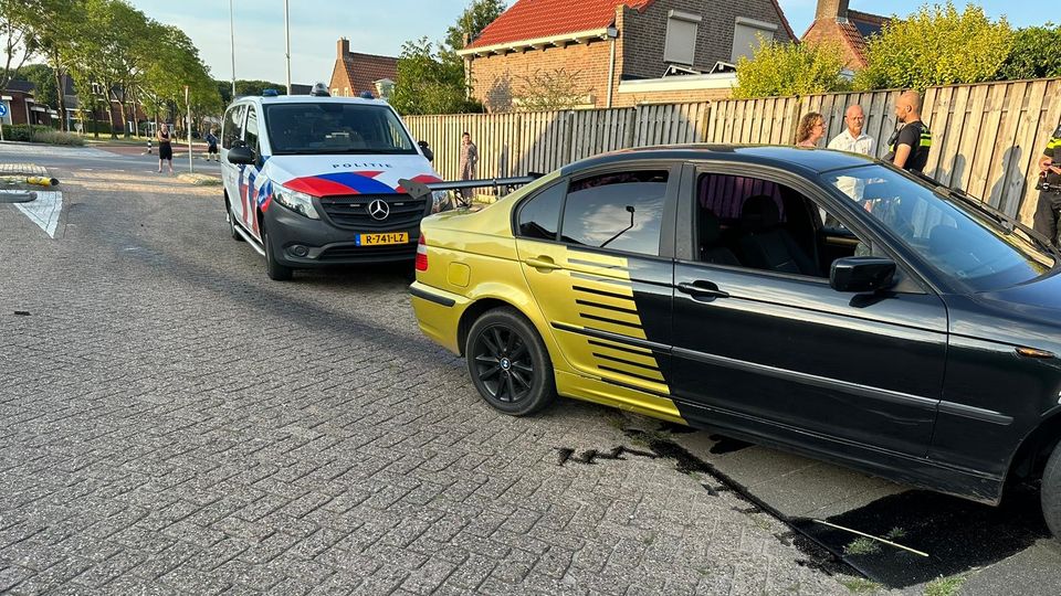 De auto reed een verkeersbord om en eindigde beschadigd op het fietspad aan de andere kant van de weg. Enkele inzittenden zijn ervandoor gegaan daarna. Een buurtbewoner zat in de tuin en hoorde de klap. Hij vertelt: “Ik zei, ho wacht even. Daar zitten er een paar tegen mekaar. Dus ik ben direct de tuin uit gevlogen om te kijken of ik misschien eerste hulp kon verlenen. Toen ik hier aan kwam zag ik dat de auto wat in elkaar zat. Wat er was gebeurd kan ik niet precies vertellen maar ik heb meteen 112 gebeld.”
