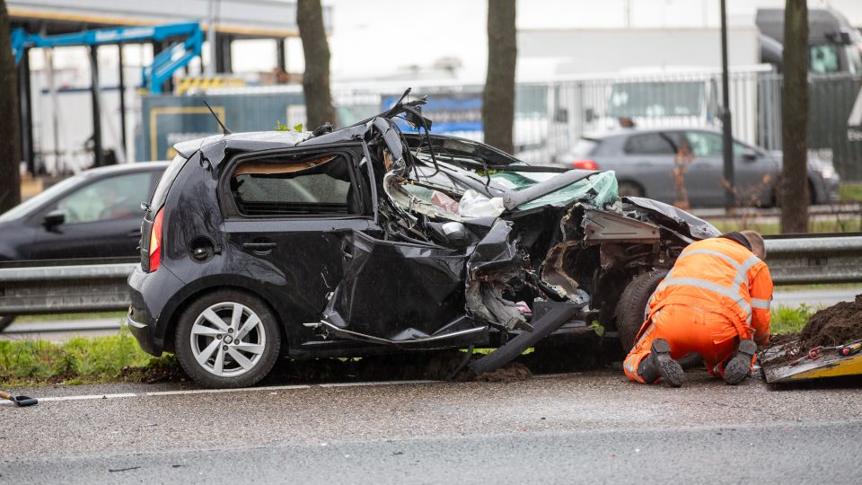 Auto zwaar beschadigd door botsing met vrachtwagen op A58