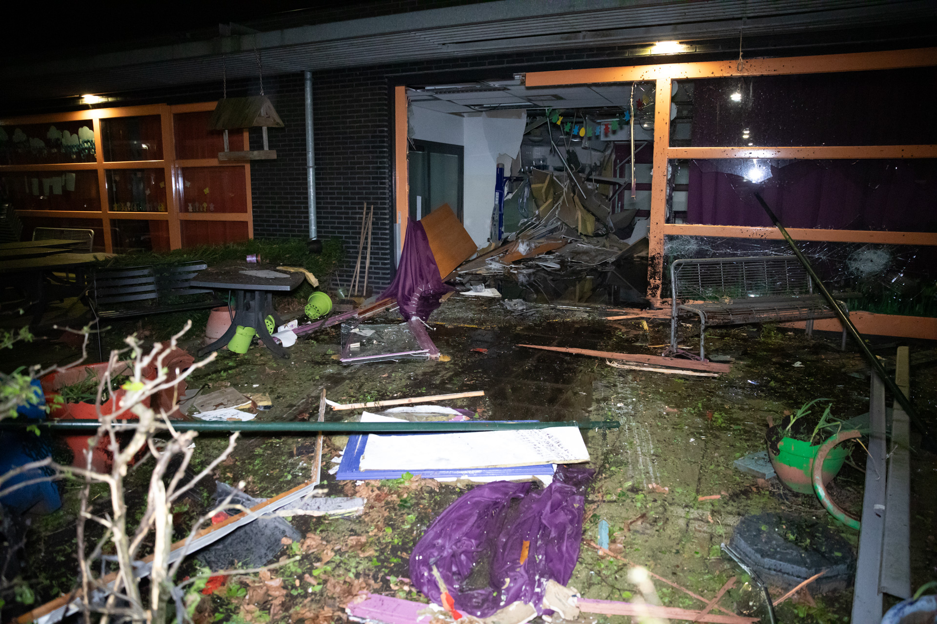 De ravage is zowel binnen als buiten het pand gigantisch. De auto is door een hekwerk geramd, vervolgens door een pui van het pand gereden en in een lokaal tot stilstand gekomen. Ook zou hij op een haar na een boom hebben gemist. Op foto’s is de grote puinhoop te zien.