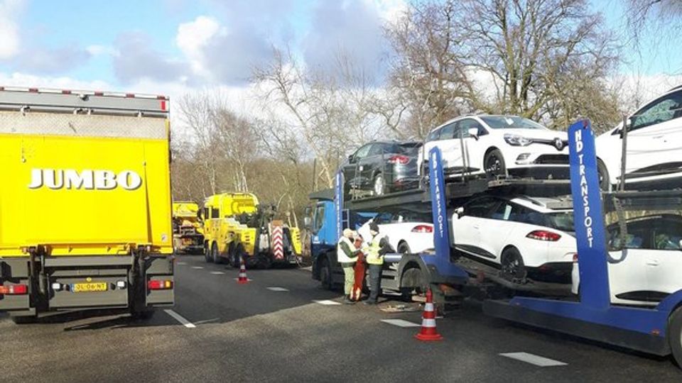 Een autotrailer met pech zorgde vrijdagmiddag voor flinke verkeershinder.