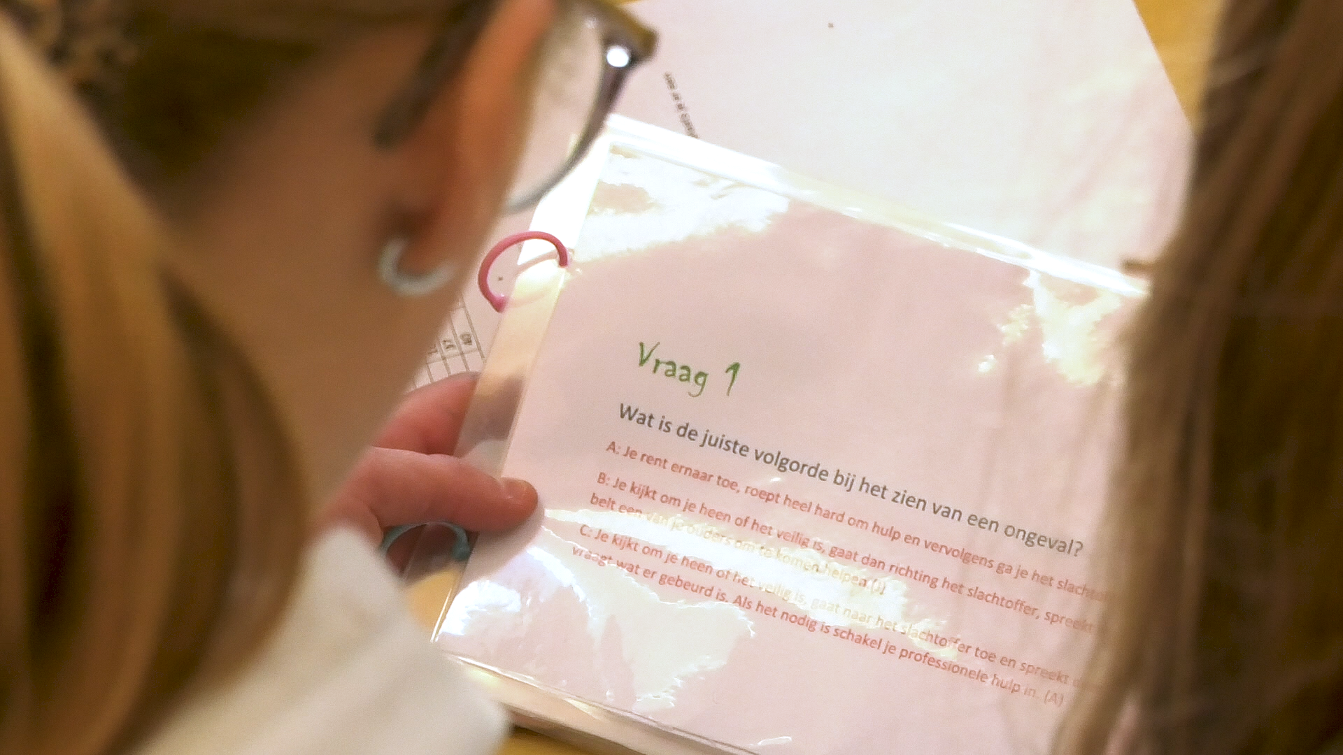 Op dit moment zijn de leerlingen richting het einde van hun lessen gekomen. “Volgensmij hebben we volgende week een examen hierover”, weet leerling Tess te vertellen. Zij is samen met haar groep druk bezig met vragen te beantwoorden als ‘waar let je op als je een wond gaat verzorgen’ en ‘wat is de juiste volgorde bij het zien van een ongeval’. “Ik vind het leuke lessen, maar wel moeilijk”, geeft de elfjarige aan. “Ik weet nu hoe ik een verbandje moet leggen en hoe ik moet reanimeren. Reanimeren is heel zwaar!”