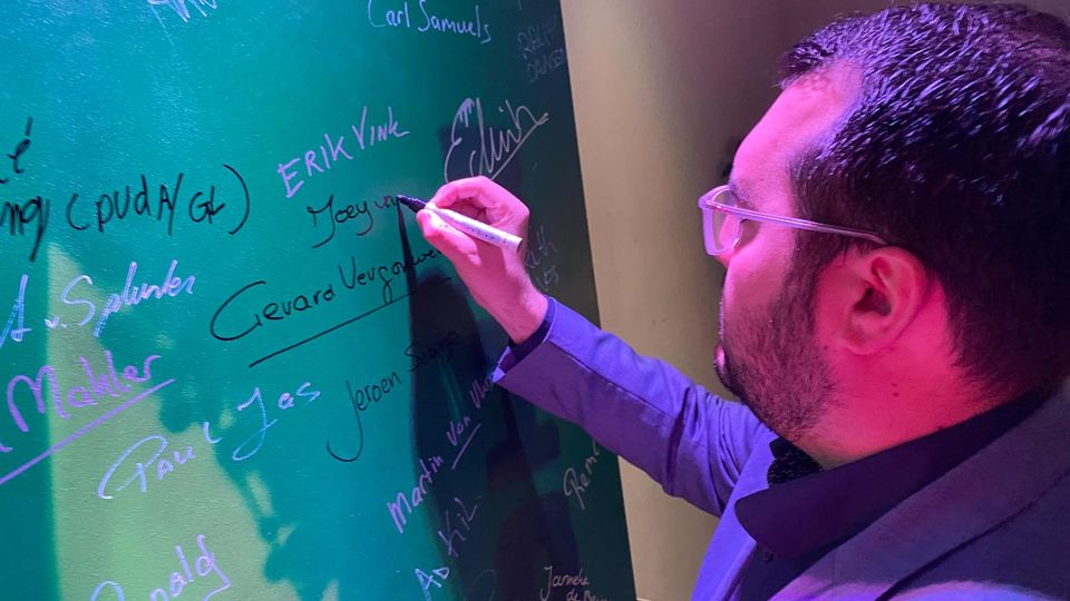 Vorig jaar april organiseerde de gemeente een congres over biobased bouwen. Wethouder Joey van Aken plaatst zijn tijdens het symposium handtekening op een biobased-kunstwerk.