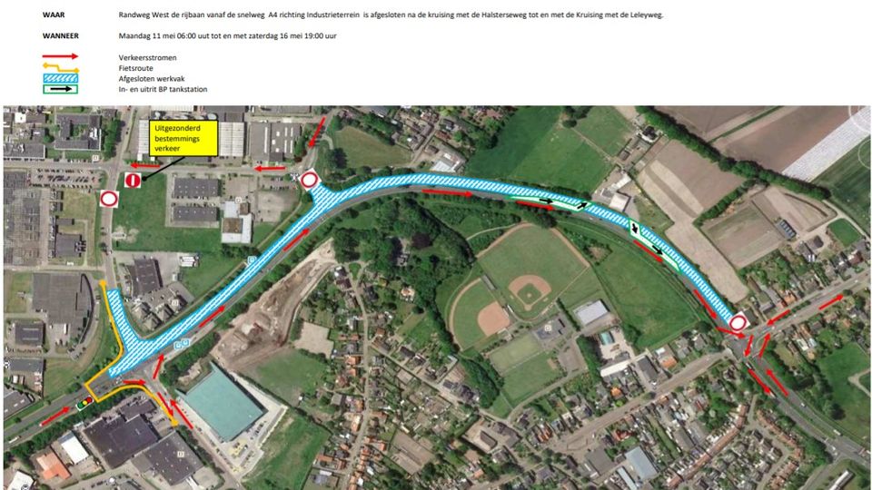 De zogenoemde ‘Fase 1’ begint op maandag 11 mei om 06.00 uur. Het gaat om de noordwestelijke rijbaan die van de A4 richting het Bergse industrieterrein loopt. Uitvoerder Dura Vermeer verwacht op zaterdag 16 mei om 19.00 uur klaar te zijn met de eerste fase.