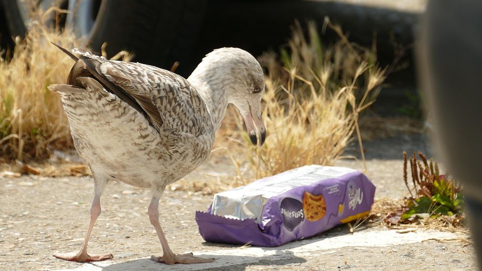 Een jonge meeuw doet zich tegoed aan een weggeworpen pak koekjes. (Foto: Pixabay)