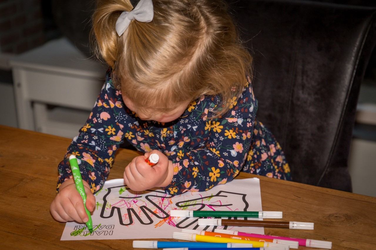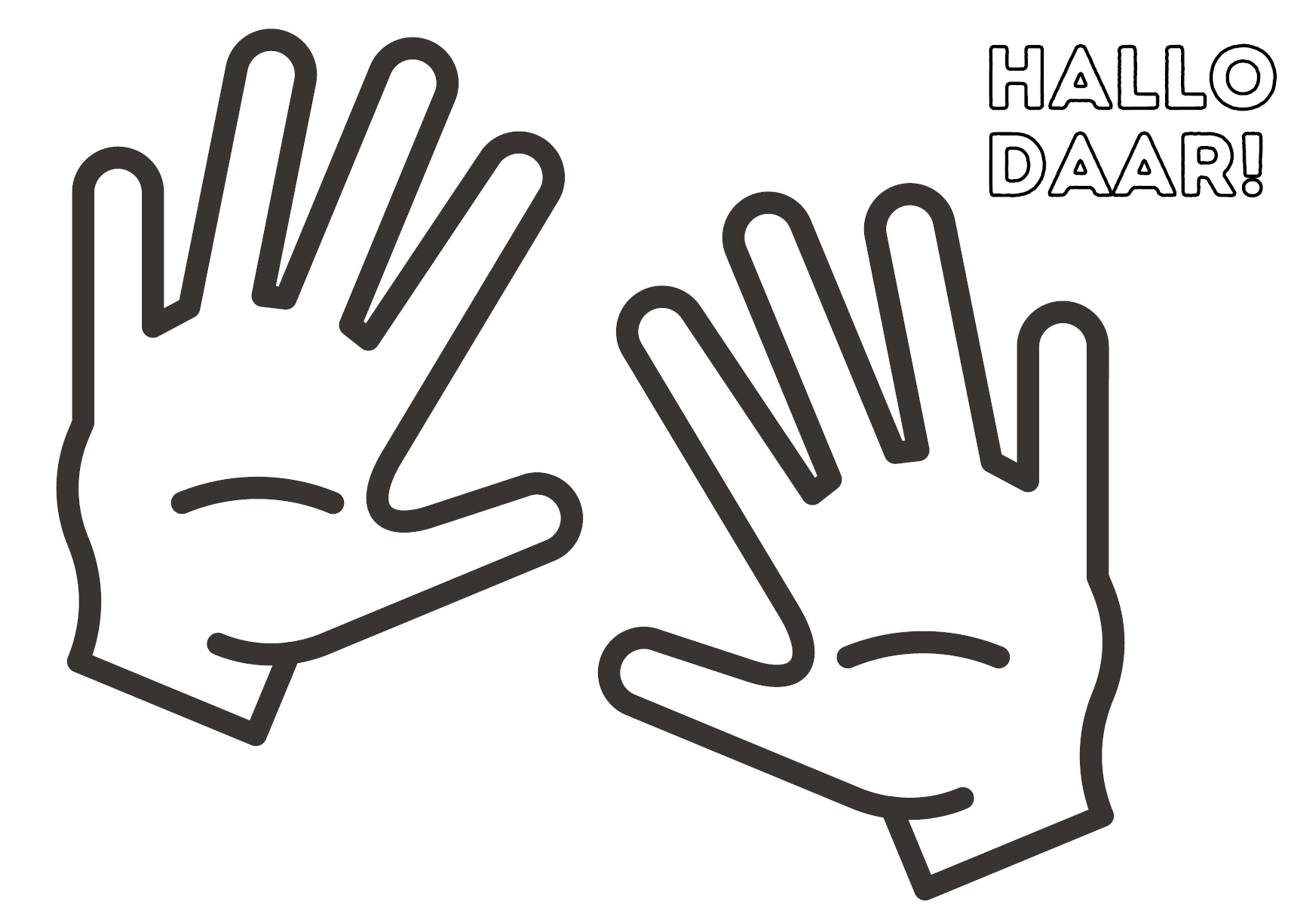 De kleurplaat was zo gemaakt. Het zijn twee zwaaiende handen, met daarnaast de tekst ‘Hallo Daar’. Kinderen kunnen die naar eigen inzicht inkleuren en verder verfraaien, om ‘m vervolgens bij iemand af te geven. Dat kan heel veilig door de brievenbus maar je kan natuurlijk ook eerst even op het raam kloppen. Vervolgens kan de ontvanger het kunstwerkje voor het raam hangen, dat is ook voor de jonge maker leuk. Het is meteen dé manier om een praatje te maken of gewoon even naar elkaar te zwaaien. Het is voor de buurt ook een mooi subtiel signaal: Stop gerust voor een praatje voor het raam of groet even.