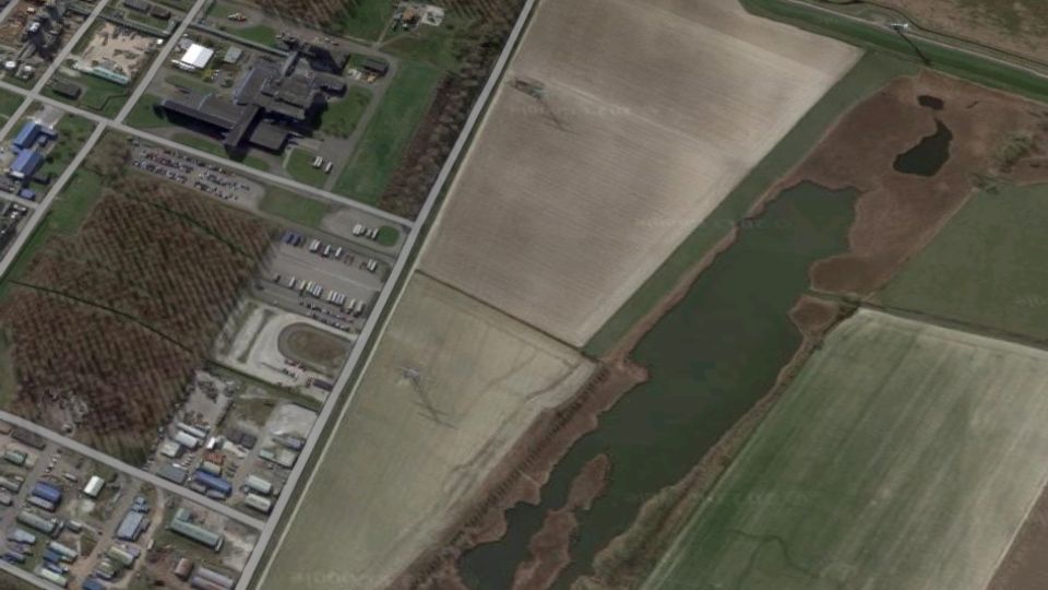 Luchtfoto met het onbebouwde industrieterrein De Spie (midden) en links het terrein van Sabic. (Google StreetView)