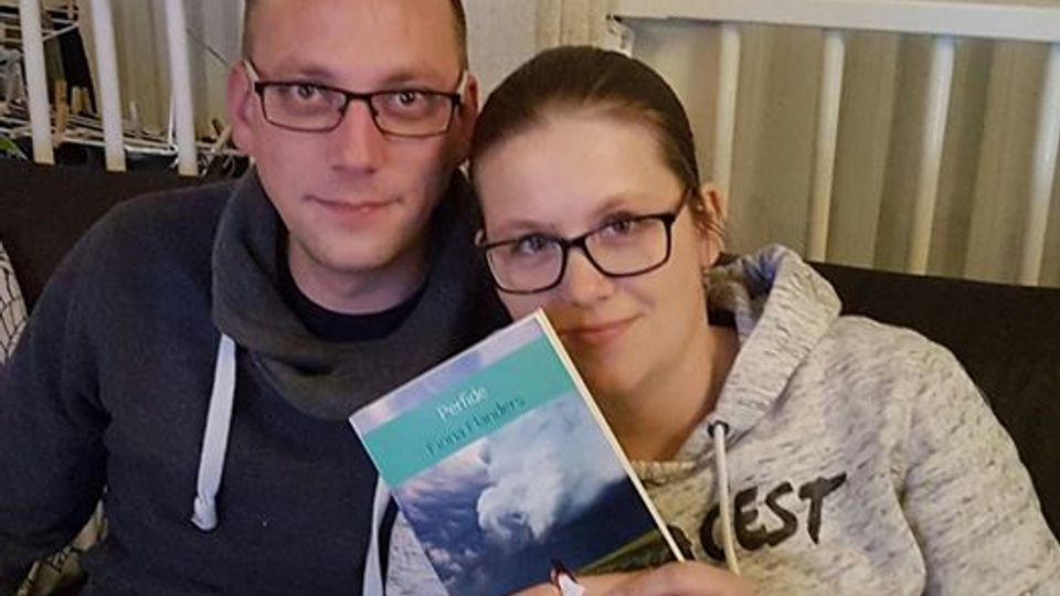 Foto: Dennis en Debora krijgen het eerste exemplaar van ‘Perfide’ overhandigd