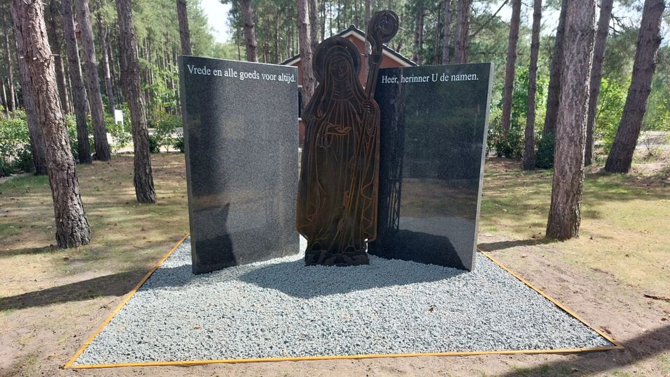 Het strooiveld is vorig jaar aangelegd op de begraafplaats. “We kregen er veel vraag naar. Mensen konden wel het een urn laten bijzetten of het as verstrooien bij het naastgelegen crematorium, maar een Rooms Katholiek strooiveld was er niet”, zegt beheerder Mark Masereeuw. Nabestaanden kunnen nu het as van hun gecremeerde overledene uitstrooien op het veld. Tot nu toe was het veldje slechts omheind met borderranden. “Het bestuur was nog op zoek naar een beeld waar alle namen op gezet konden worden. Pastoor Paul Verbeek kwam met het idee om een beeld van Gertrudis van Nijvel te plaatsen.”