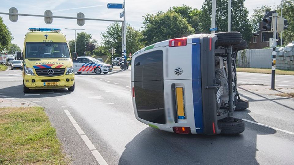 Een bestelbus is maandagochtend op zijn kant terecht gekomen na een botsing met een personenauto. Bij het ongeluk raakte de bestuurder van de bestelbus gewond.