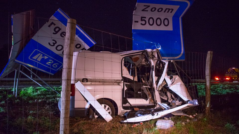Een bestelbusje is dinsdagnacht in volle snelheid op een verkeersbord langs de A4 tussen Bergen op Zoom en Halsteren gebotst. Bij het ongeluk zou ook een vrachtwagen betrokken zijn geweest. De bestuurder van het busje is door de ambulance naar het ziekenhuis gebracht. Het is niet bekend hoe hij eraan toe is.