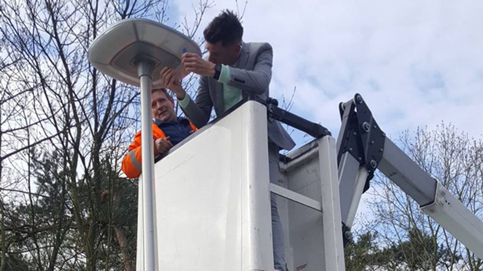 Wethouder Jeffrey van Agtmaal monteerde de laatste armatuur op een van de slimme lichtmasten (foto: Gemeente Woensdrecht)