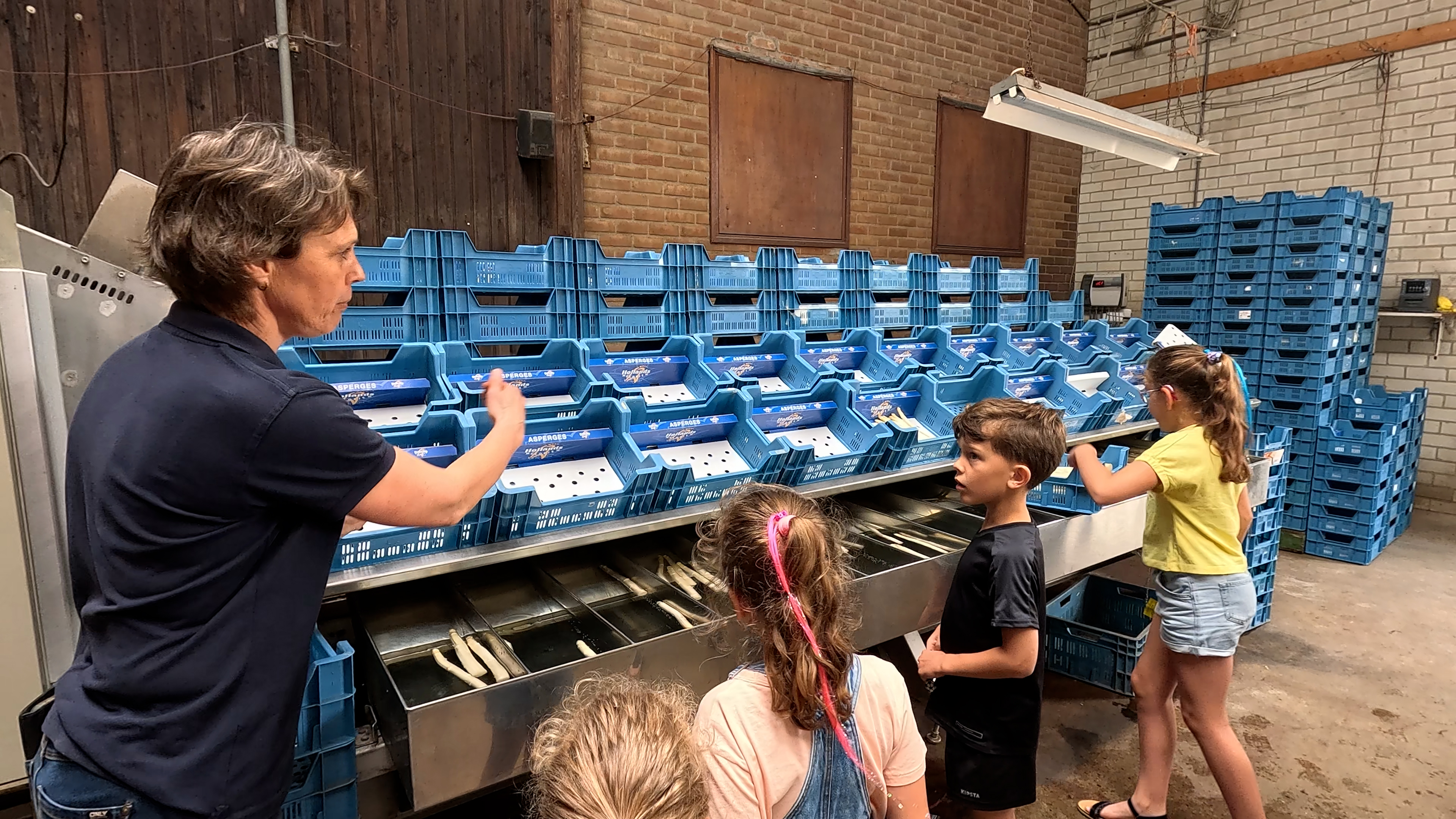 Bij aspergekwekerij Vos kunnen mensen de verschillende machines bekijken die gebruikt worden bij het kweken van het witte goud. Ook de schuur met de sorteermachine is open. Een mevrouw met een beige trui is net met haar kinderen gaan kijken. “Ik heb geleerd dat er verschillende groottes zijn en dat ze gesorteerd worden”, zegt ze. Het is de eerste stop van de fietstocht voor haar. “Ik vind het heel leuk om in de omgeving te zien wat de boeren doen en voor mijn kinderen vind ik het ook heel leuk. Om ze te leren hoe dat verbouwt wordt”, voegt ze toe.