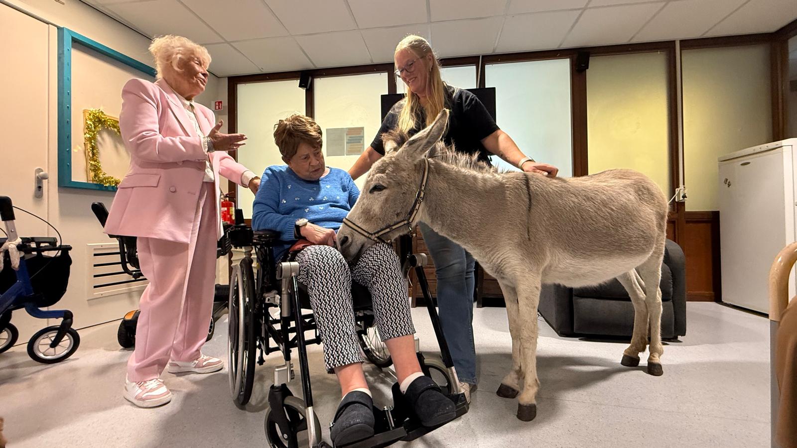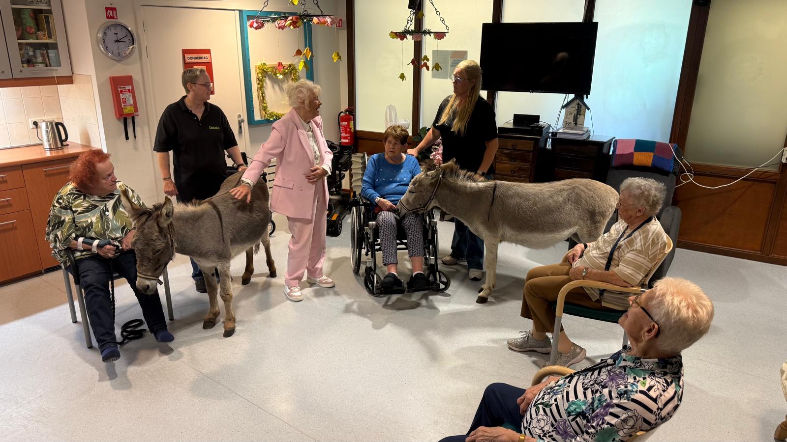Bijzonder bezoek aan verzorgingstehuis: ezeltjes Lizzy en Fayke knuffelen met bewoners