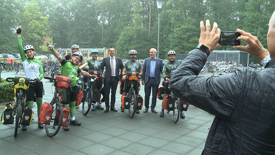 De fietsers van Bike for Europe gaan samen op de foto met burgemeester Adriaansen en Piet Antonissen van het ZWH Wielercollege